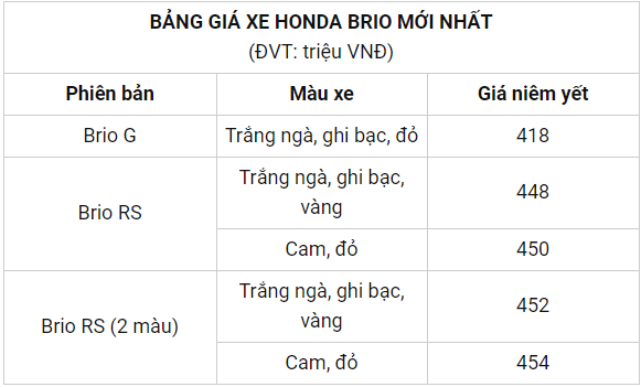 Giá xe Honda Brio 2021 với 3 phiên bản G, RS và RS 2 màu từ 418-454 triệu đồng