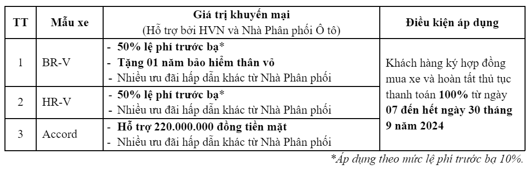 Đồng thời, HVN phối hợp cùng hệ thống Nhà Phân phối triển khai chương trình khuyến mại hấp dẫn từ ngày 07 đến hết ngày 30 tháng 9 năm 2024 dành cho các dòng xe nhập khẩu: Honda HR-V, Honda BR-V, Honda Accord.