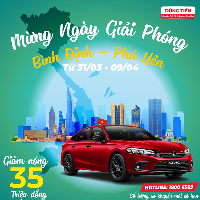 Nhằm kỷ niệm Ngày Giải Phóng Bình Định – Phú Yên và tăng thêm cơ hội sở hữu và trải nghiệm các sản phẩm ôtô Honda đến nhiều hơn nữa khách hàng trên cả nước, đồng thời hỗ trợ một phần chi phí mua xe cho khách hàng trong tháng 3, Honda Việt Nam phối hợp cùng Dũng Tiến – Honda Ô tô Bình Định Phú Yên triển khai chương trình khuyến mại dành riêng cho khách hàng mua xe ôtô Honda: