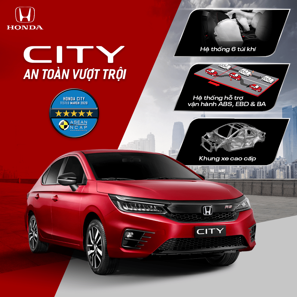 Honda CITY thế hệ mới vinh dự được đánh giá đạt tiêu chuẩn an toàn 5 sao ASEAN NCAP (Chương trình đánh giá xe mới Đông Nam Á). Những tính năng an toàn này góp phần giúp chủ sở hữu Honda CITY mới luôn an tâm cầm lái để chinh phục mọi cung đường.