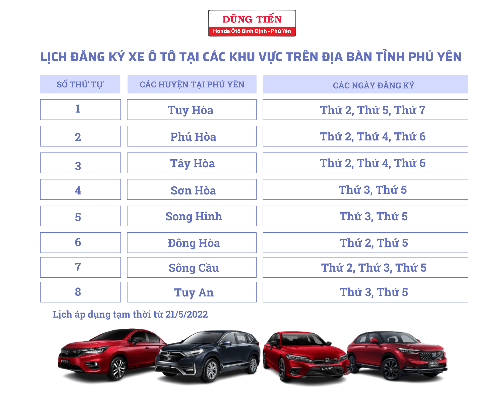 Lịch đăng ký xe ô tô tại các khu vực trên đia bàn tỉnh Bình Định, Phú Yên: